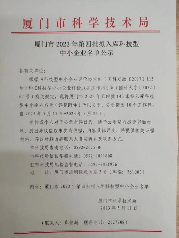廈門(mén)市2023年第4批擬入庫(kù)科技型中小企業(yè)名單公示正文.jpg PICTURE