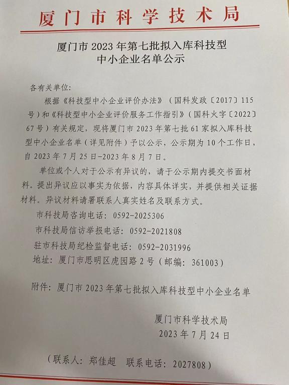 廈門市2023年第7批擬入庫科技型中小企業(yè)名單公示