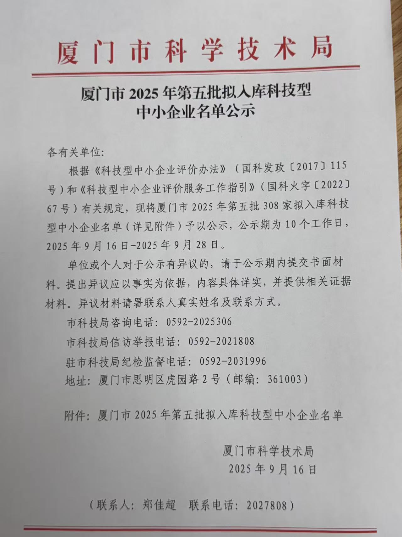 廈門市2025年第5批擬入庫科技型中小企業(yè)名單公示
